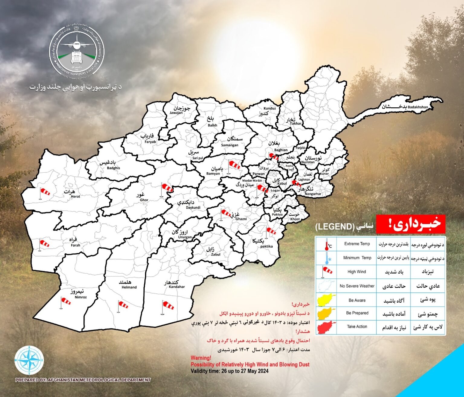 این وزارتخانه طالبان روز دوشنبه، ۷ جوزا، با نشر خبرنامهای نوشته است که این احتمال فردا (سهشنبه) در ولایتهای بدخشان، تخار، بغلان و پنجشیر به شمول سالنگها وجود دارد.